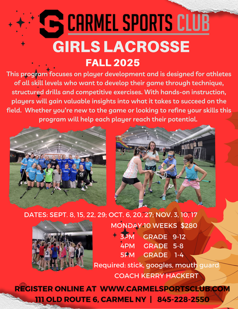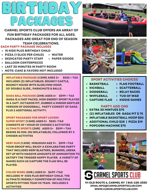 Carmel Sports Club is a 50,000 square foot, fully air conditioned/heated indoor turf space that facilitates multiple purposes. We provide year round programs in sports such as Soccer, Lacrosse, Baseball, Softball, Football, Agility training, Fitness, and Summer Sports Camps. We also offer birthday parties and private events. Our goal is to provide the best services and ensure excellent customer service. We strive to make a difference in your life whether it is training or throwing your special event.